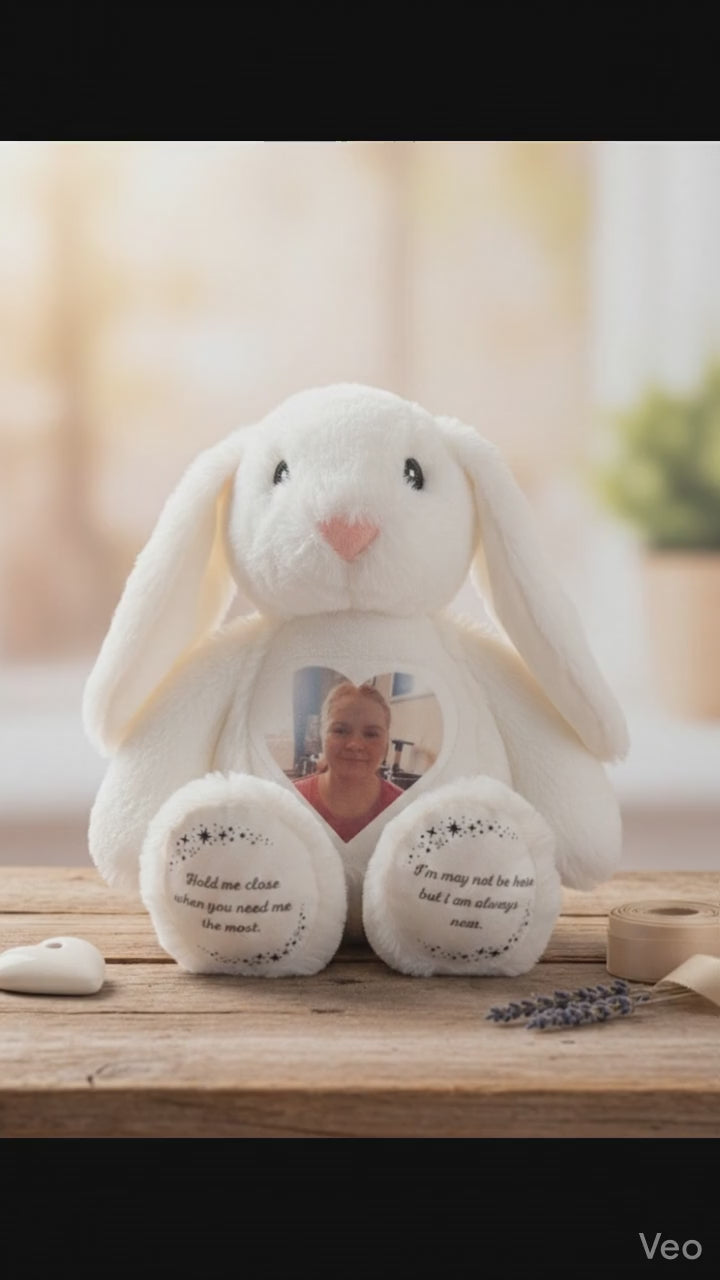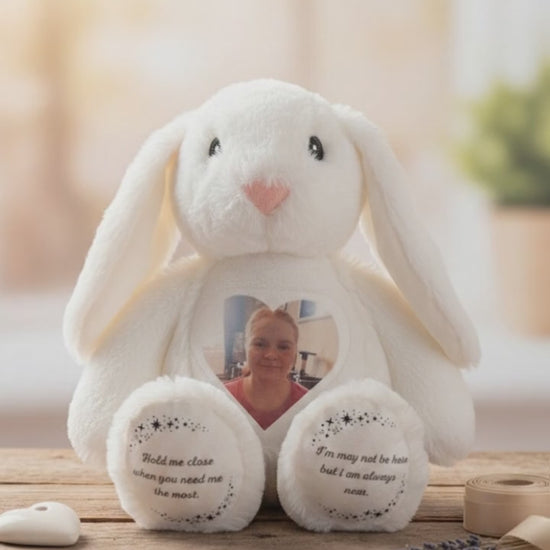 Crafted from ultra-soft, premium plush fabric, this keepsake bunny features a beautiful heart-shaped photo patch on its chest and sweet, sentimental messages on its paws to remind you that your loved one is never truly far away.