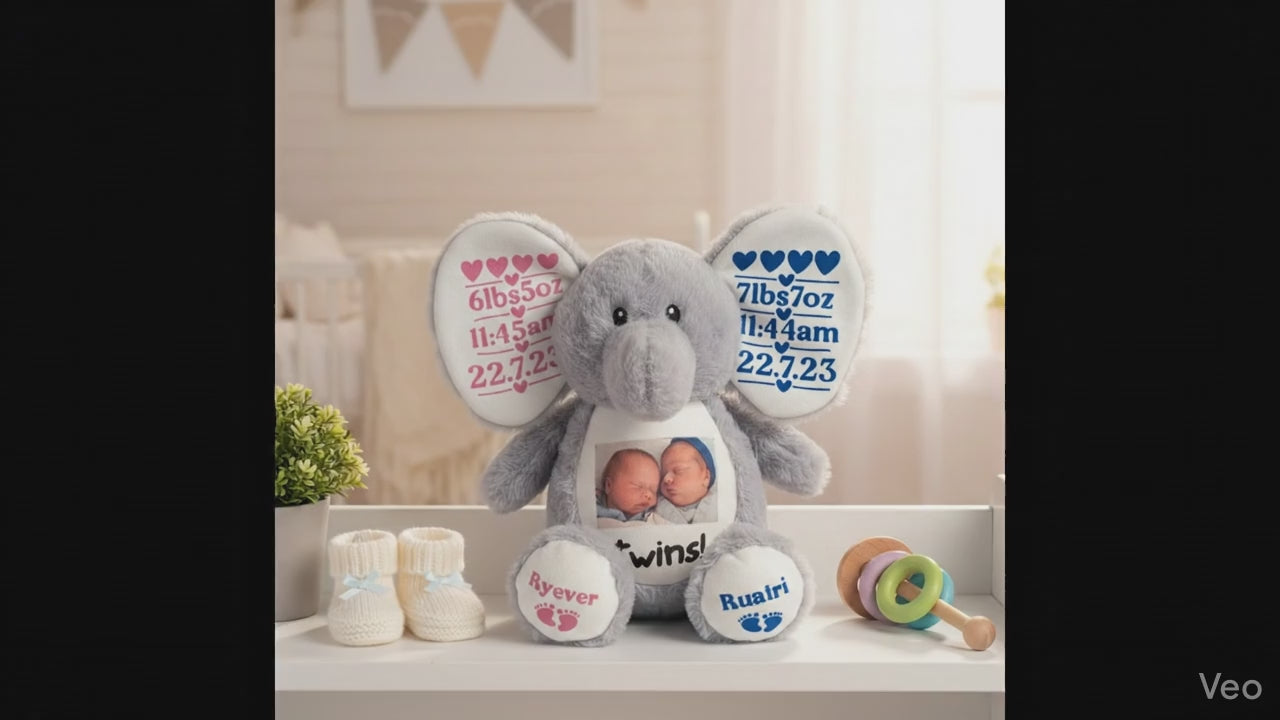 Celebrate the arrival of your double bundles of joy with a keepsake that lasts a lifetime. This ultra-soft, plush elephant is custom-designed to display all the precious details of your twins' birth, complete with a high-quality photo of the little ones right on the tummy.